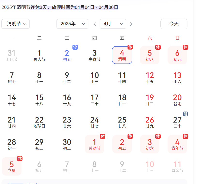 一、放假時間2025年清明節(jié)假期為4月4日(星期五)至4月6日(星期天),共計3天。